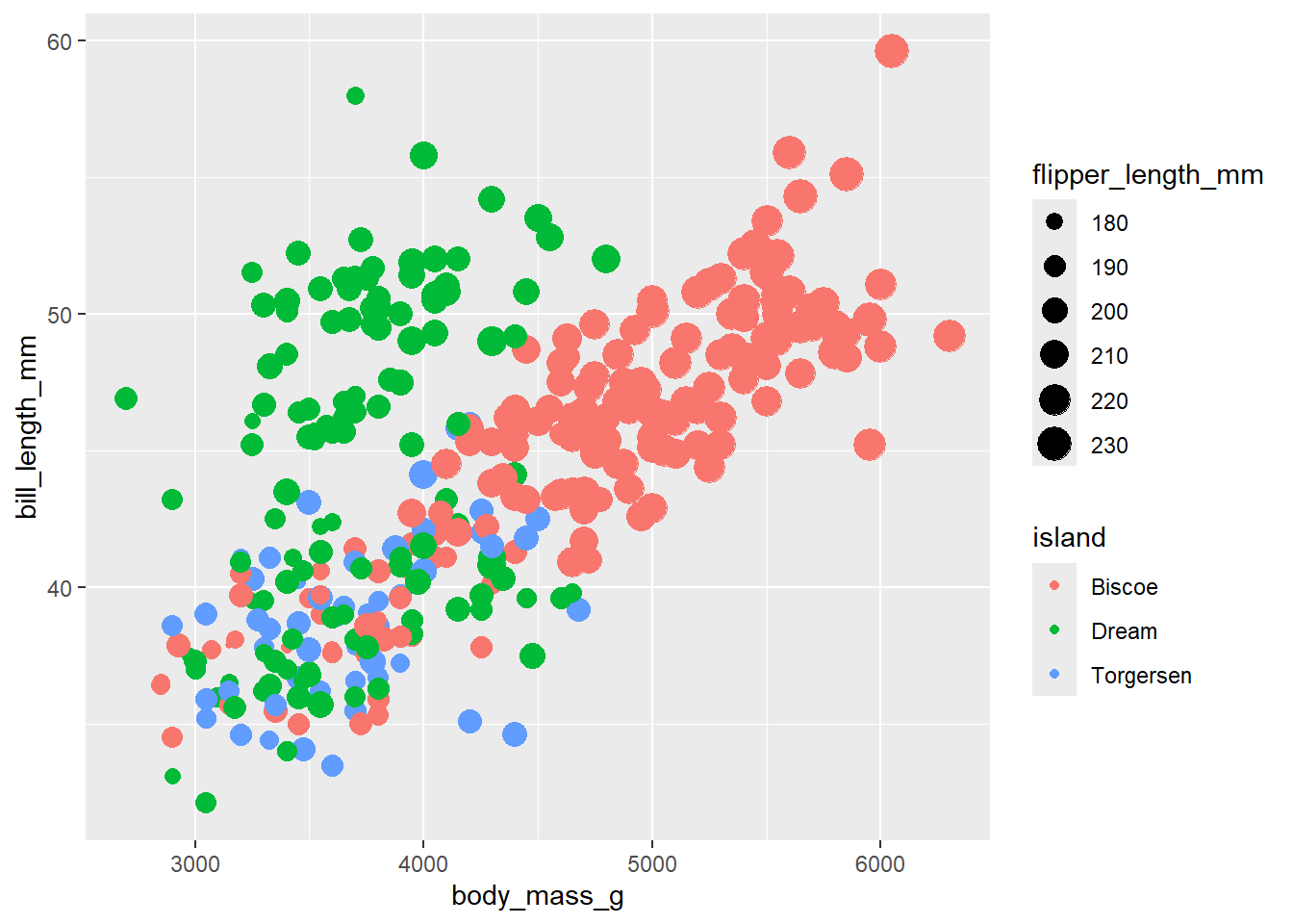 ggplot(aes(x = body_mass_g, y = bill_length_mm, color = island, size = flipper_length_mm)) +